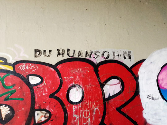 Zum Abschluss mein Highlight des Tages. Als ich eben mit meinen Mädels noch im Eis-Café saß und Folgendes herumzeigte, erntete ich nicht den erhofften Grad an Reaktion, fiel die Begeisterung doch gemeinhin verhalten aus. In meinem Kopf löst solch eine ungewollt komische Schmiererei sofort etwas aus. Wer das wohl war, was die Beweggründe waren und wie der Delinquent wohl das Wort "Rhythmus" schreiben würde. Oder "Malheur".