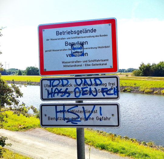 Der "Battle" an der Mündung des Elbe-Seitenkanals findet jedenfalls zwischen Hansa und Rauten statt. Guckt mal oben rechts im Bild über der Treppe, das Schild. Nach Beschau der Vorderseite entfährt mir unweigerlich ein: "RETTET DEM DATIV!" Dem, verdammt nochmal, ist es denn so schwer?