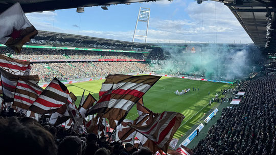 Das alkoholische Warming Up verlief altersgerecht mit eher wenigen und kleineren Gläsern, man möchte schließlich mit einigermaßen klarem Kopf das Match gucken. Erste Liga, mitnehmen, genießen, gönn dir. „Du spielst ganz woanders - in Liga 2“ war lange genug. Im Gästeblock des Weserstadions hatte ich das Pech, dass eine sehr große und die komplette erste Halbzeit ohne Pause geschwenkte Fahne ungefähr 70 % der Spielfeldsicht verdeckte. Erst mal Respekt dem (glaube weiblichen) Fan zu dieser Ausdauer und ich finde das auch gut und sehe mich keinesfalls im Team „Fahne runter!“ Andererseits war es für die Augen und die Konzentration schlicht anstrengend, weil man oft halt nicht mitbekam, was da unten auf dem Platz gerade passierte. Immer so Bruchstücke, den Rest musste man irgendwie erfühlen. Aber damit muss man immer rechnen. In der zweiten Halbzeit wurde die Flagge dann woanders geschwenkt, insofern alles chico.